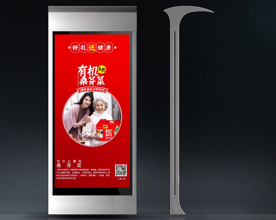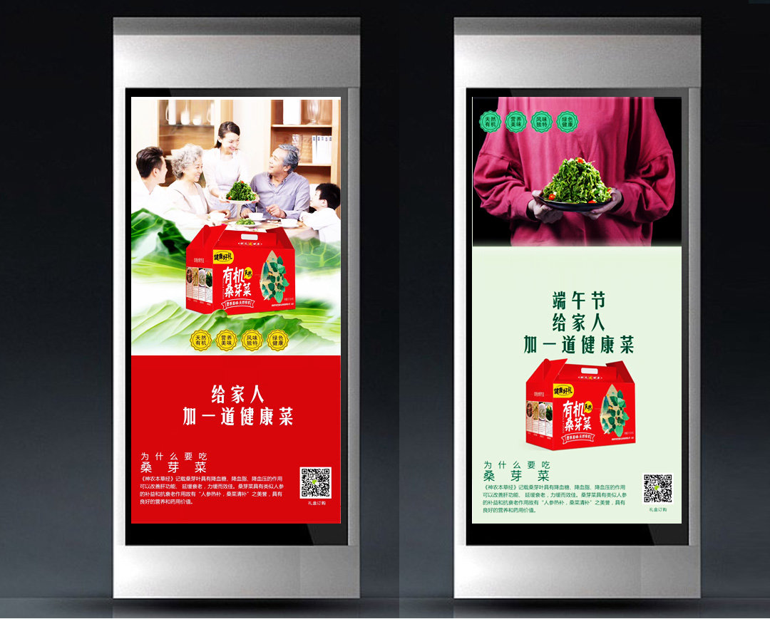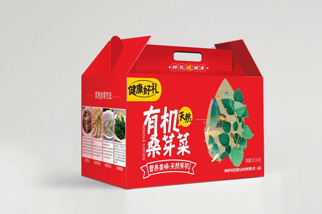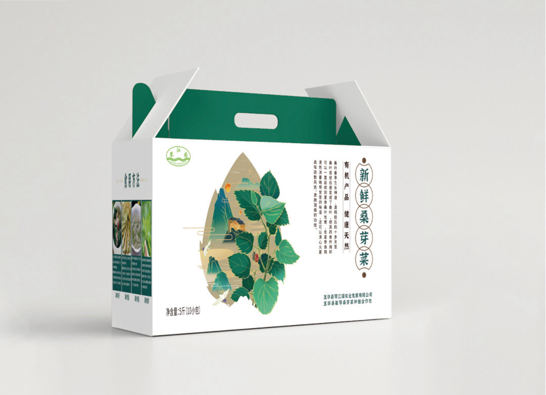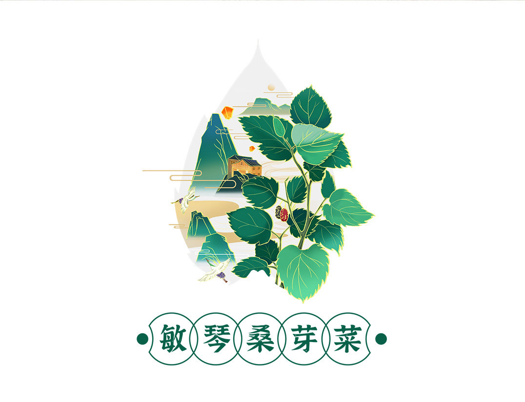 设计采用插画的形式呈现,嫩绿的桑芽菜,优美的山水田野,简洁大方,将民俗风情展示现代化风格。打造农副产品新形象,可用于礼品赠送以及佳节采购。