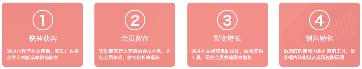 借助微信微信生态,帮助商家搭建以私域会员裂变运营为核心的小程序电商系统,解决商家快速获客、会员留存、裂变增长等核心经营问题,从而实现商家销量快速自动增长,让商家生意越做越旺。